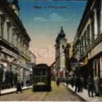 1917 Pécs, Király utca, Főpályaudvar felé közlekedő villamos, Molnár János csemege és fűszerkereskedő, Balog György Kőbányai sörcsarnoka és Spiegel József cipész üzlete, megállóhely. Alt és Böhm kiadása (Rb)