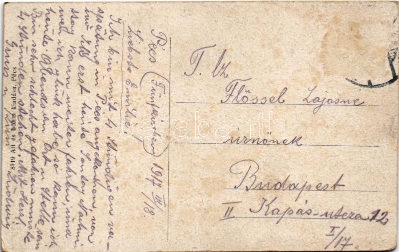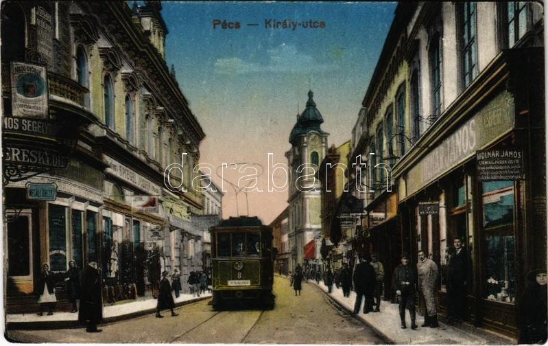 1917 Pécs, Király utca, Főpályaudvar felé közlekedő villamos, Molnár János csemege és fűszerkereskedő, Balog György Kőbányai sörcsarnoka és Spiegel József cipész üzlete, megállóhely. Alt és Böhm kiadása (Rb)<a href="https://www.darabanth.com/hu/nagy
