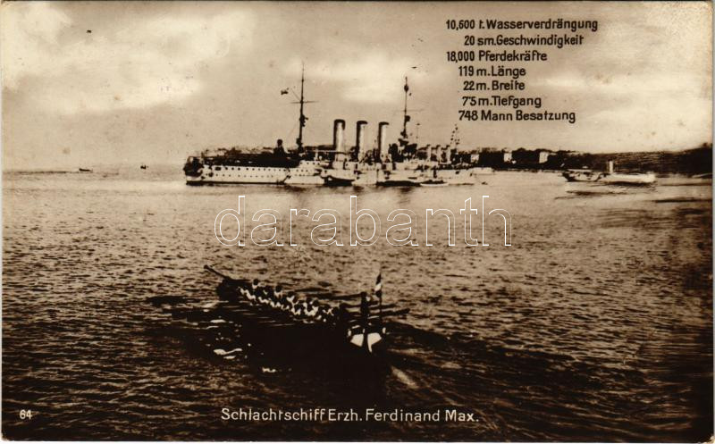 1918 Schlachtschiff Erzh. Ferdinand Max. K.u.K. Kriegsmarine / SMS Erzherzog Ferdinand Max az Osztrák-Magyar Haditengerészet Erzherzog-osztályú pre-dreadnought csatahajója / WWI Austro-Hungarian Navy, Erzherzog-class pre-dreadnought