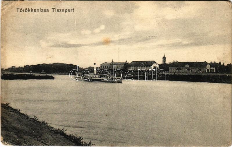 1919 Törökkanizsa, Nova Kanjiza, Novi Knezevac; Tisza-part, pontonhíd, gőzhajó / Tisa riverside, pontoon bridge, steamship (Rb)