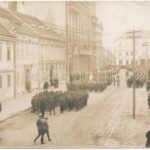 1921 Sopron, Ostenburg különítmény (csendőrzászlóalj) díszfelvonulása augusztus 29-én délelőtt 9 órakor a Postapalota előtt (Sopron város Ausztriának (Burgenland tartomány) történő hivatalos átadásának napja). A