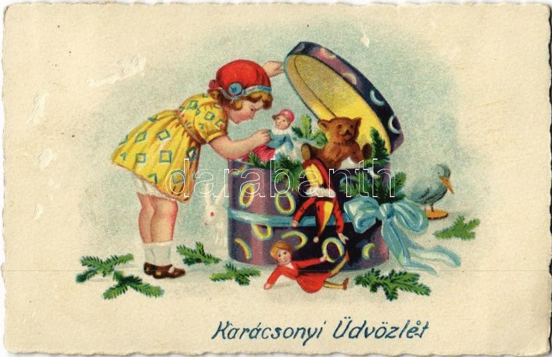 1927 ‘Karácsonyi Üdvözlet’, üdvözlőlap / Christmas greeting card, girl with presents, litho (surface damage)<a href="https://www.darabanth.com/hu/gyorsarveres/421/kategoriak~Kepeslapok/Udvozlolapok-Unnepek~1500051/1927-Karacsonyi-Udvozlet-udvozlolap