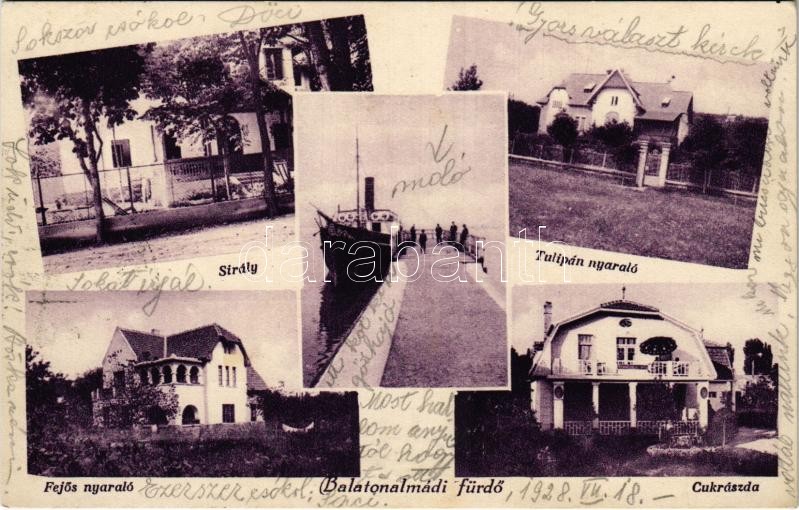 1928 Balatonalmádi, Sirály, Tulipán, Fejős nyaralók, móló gőzhajóval, cukrászda<a href="https://www.darabanth.com/hu/gyorsarveres/415/kategoriak~Kepeslapok/Magyarorszag~1000005/1928-Balatonalmadi-Siraly-Tulipan-Fejos-nyaralok-molo-gozhajoval-cukrasz