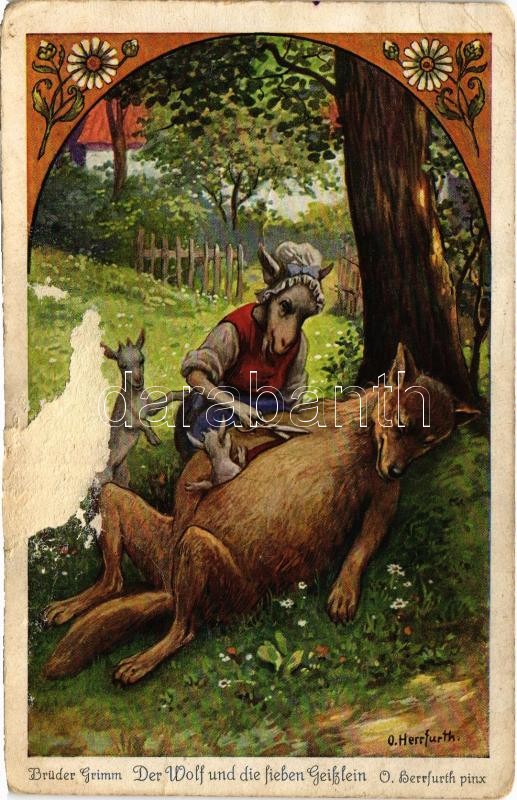 1928 Brüder Grimm – ‘Der Wolf und die Sieben Geißlein’ s: O. Herrfurth (felületi sérülés / surface damage)<a href="https://www.darabanth.com/hu/gyorsarveres/423/kategoriak~Kepeslapok/Muveszlapok~1500080/1928-Bruder-Grimm-Der-Wolf-und-die-Sieben-GeiC