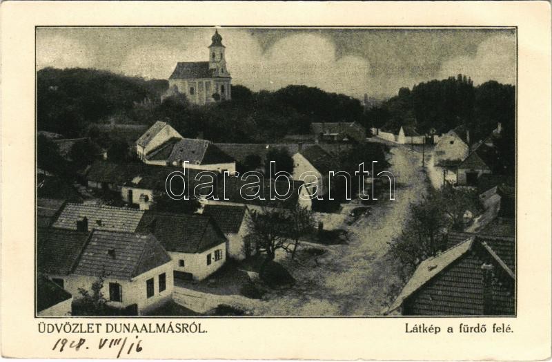 1928 Dunaalmás, látkép a fürdő felé, templom, utca