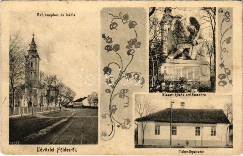 1928 Földes, Református templom és iskola, Takarékpénztár, Elesett hősök szobra, emlékmű. Falus felvétele. Hangya szövetkezet kiadása (fa)