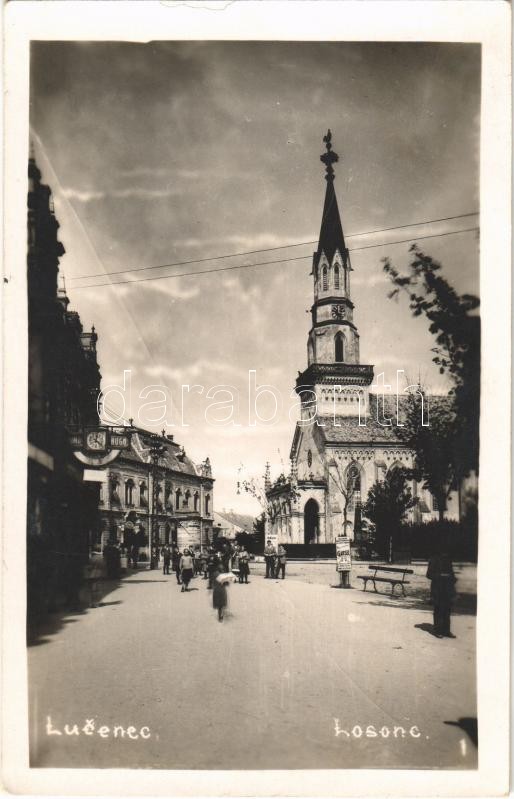 1932 Losonc, Lucenec; utca, templom, Halmos Hugó üzlete / street, church, shops. photo<a href="https://www.darabanth.com/hu/gyorsarveres/419/kategoriak~Kepeslapok/Felvidek~1500007/1932-Losonc-Lucenec-utca-templom-Halmos-Hugo-uzlete-street-church-sho