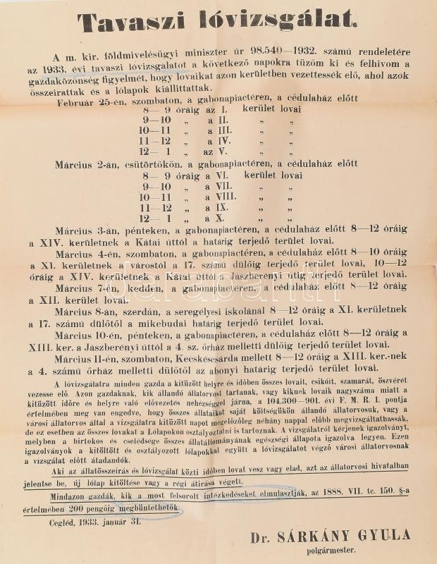 1933 Cegléd lóvizsgálat hirdetménye plakát 32×44 cm