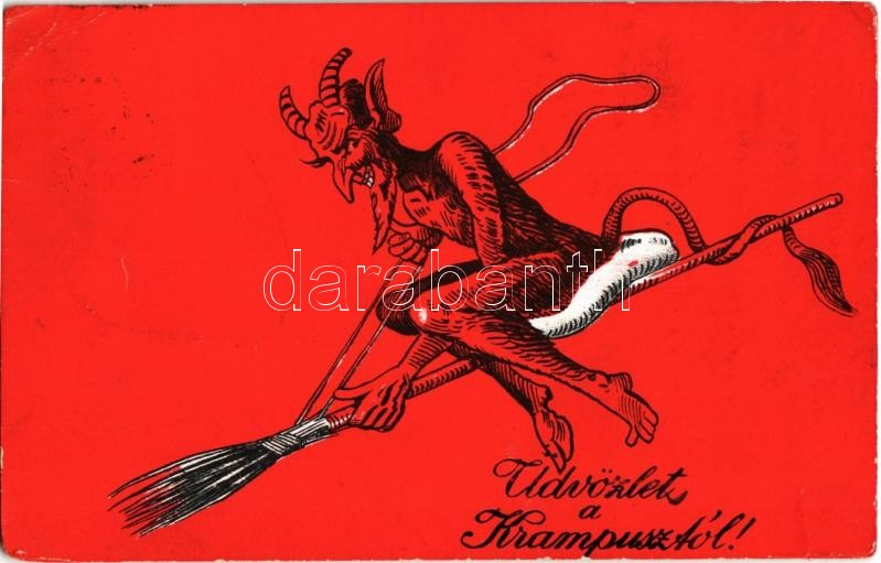 1933 Üdvözlet a Krampusztól! / Krampus greeting art postcard with Krampus flying on a broomstick (szakadás / tear)<a href="https://www.darabanth.com/hu/gyorsarveres/413/kategoriak~Kepeslapok/Krampusz~2000071/1933-Udvozlet-a-Krampusztol-Krampus-greet