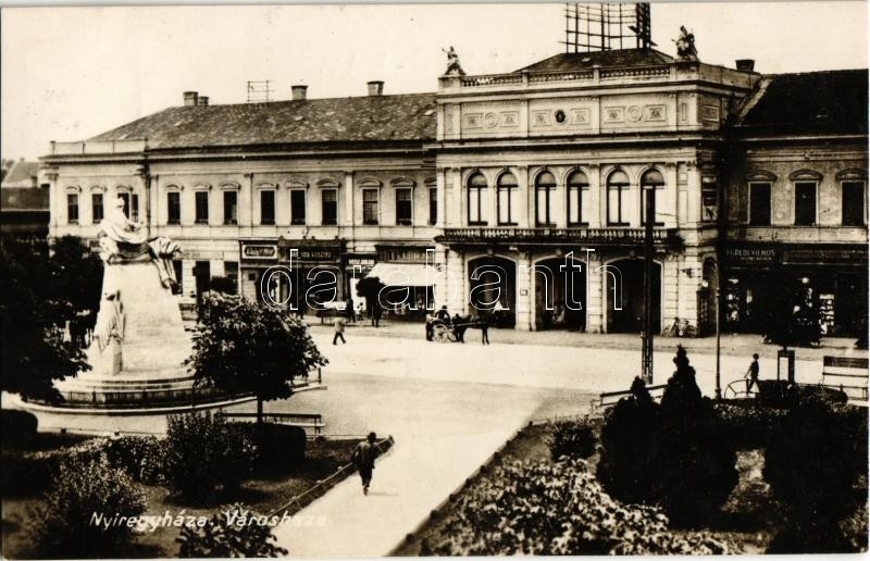 1934 Nyíregyháza, Városháza, Feuer Miksa, Weisz Jakab, Barsch Gusztáv, Füredi Vilmos üzlete, Kossuth szobor. Kiadja Fábián Pál
