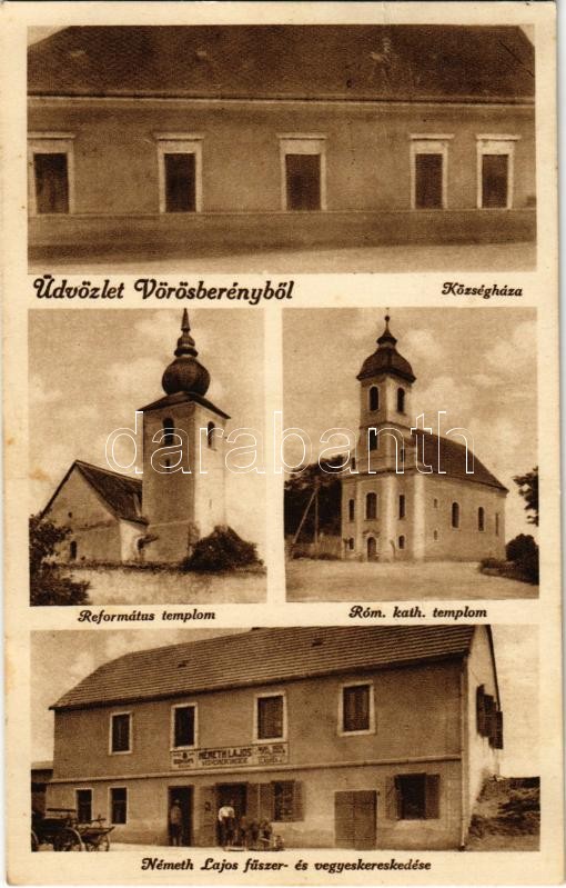 1934 Vörösberény (Balatonalmádi), Községháza, Református templom, Római katolikus templom, Németh Lajos üzlete és saját kiadása (Rb)