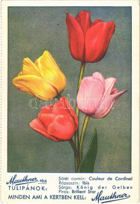 1936 Mauthner Ödön magtermelő- és magkereskedelmi rt. reklám. Mauthner-féle tulipánok / Hungarian seed merchant advertisement<a href="https://www.darabanth.com/hu/gyorsarveres/413/kategoriak~Kepeslapok/Reklam~2000086/1936-Mauthner-Odon-magtermelo-es