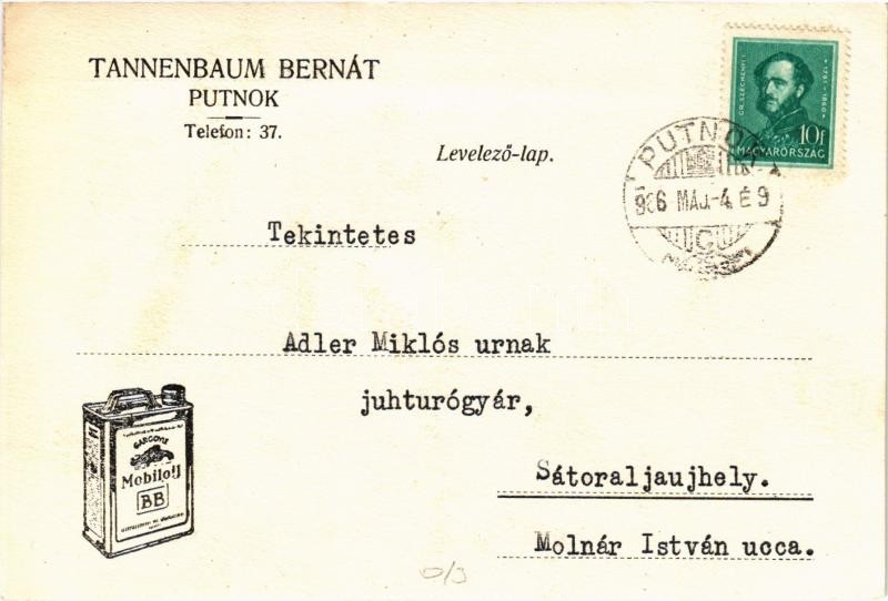1936 Putnok, Tannenbaum Bernát mobiloil reklám. Hátoldalon kóser csemegetúró rendelés (EK)<a href="https://www.darabanth.com/hu/gyorsarveres/423/kategoriak~Kepeslapok/Reklam~1500083/1936-Putnok-Tannenbaum-Bernat-mobiloil-reklam-Hatoldalon-koser-csem