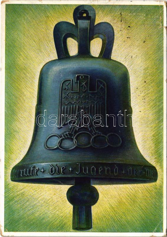 1936 Werbe Postkarte Nr. 1. für die Olympischen Spiele, Berlin. Olympiaglocke / Summer Olympics in Berlin, So. Stpl (EB)<a href="https://www.darabanth.com/hu/gyorsarveres/440/kategoriak~Kepeslapok/Olimpia~2000037/1936-Werbe-Postkarte-Nr-1-fur-die-Ol