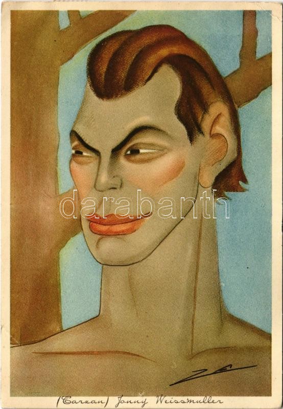 1937 Johnny Weissmuller bánsági sváb származású amerikai olimpiai bajnok úszó, filmszínész, Tarzan alakítója, olasz karikatúra / American Olympic swimmer and actor, Italian caricature. Eliocromia Zacchetti e C. Milano s: Nino Za (EK)