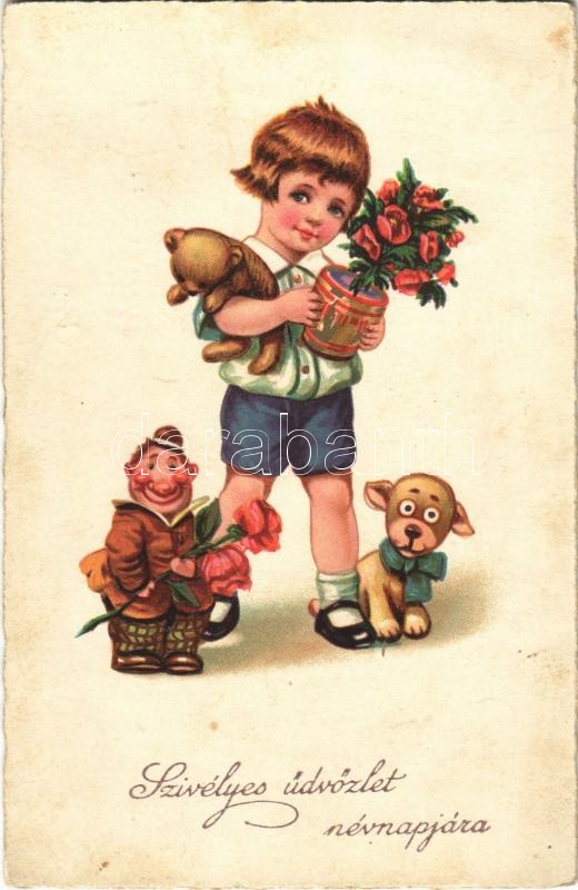 1937 Szívélyes üdvözlet névnapjára / Name Day greeting card, child with toys. WSSB. 4487g. (fl)<a href="https://www.darabanth.com/hu/gyorsarveres/417/kategoriak~Kepeslapok/Udvozlolapok-Unnepek~1500070/1937-Szivelyes-udvozlet-nevnapjara-Name-Day-gree