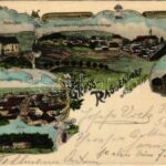 1938 Raggendorf, Kirche und Schule, Warthberg, Mühle, Schloss, Gross-Schweinbarther Strasse / church, school, mill, castle, street. Art Nouveau, floral