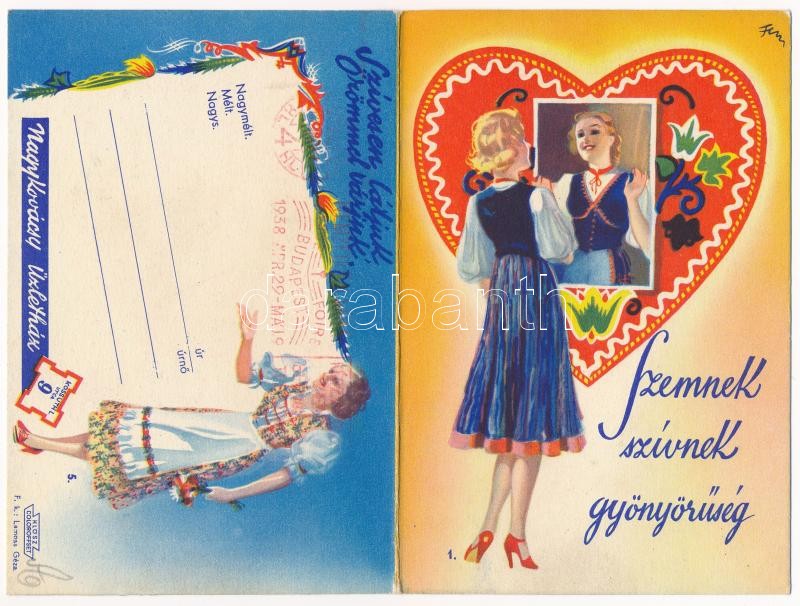 1938 Szemnek szívnek gyönyörűség. Nagykovácsy üzletház ‘Bokréta’ kihajtható reklámja. Budapest V. Kossuth Lajos utca 9. Lamoss Géza kiadása / Hungarian fashion advertisement, folding card s: Fery Antal<a href="https://www.darabanth.com/hu/gyorsarver