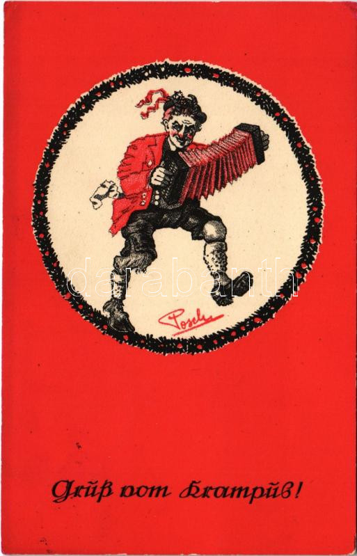 1939 Grüss vom Krampus! / Krampusz harmonikával / Krampus with accordion. Franz Knollmüller F.K.G. 3490/3.<a href="https://www.darabanth.com/hu/gyorsarveres/439/kategoriak~Kepeslapok/Krampusz~2000056/1939-Gruss-vom-Krampus-Krampusz-harmonikaval-Kram