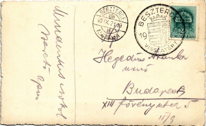 1940 Beszterce, Bistritz, Bistrita; Evangélikus templom / Lutheran church. photo + ‘1940 Beszterce visszatért’ So. Stpl. (kis szakadás / small tear)