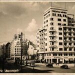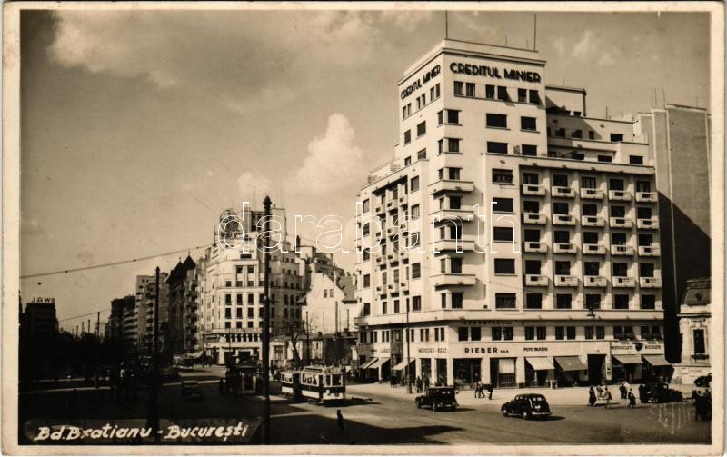 1940 Bucharest, Bukarest, Bucuresti, Bucuresci; Bd. Bratianu, Creditul Minier, Mercedes-Benz, Foto Bucegi, Motociclete Biciclete / street view, tram, shops, automobiles. photo