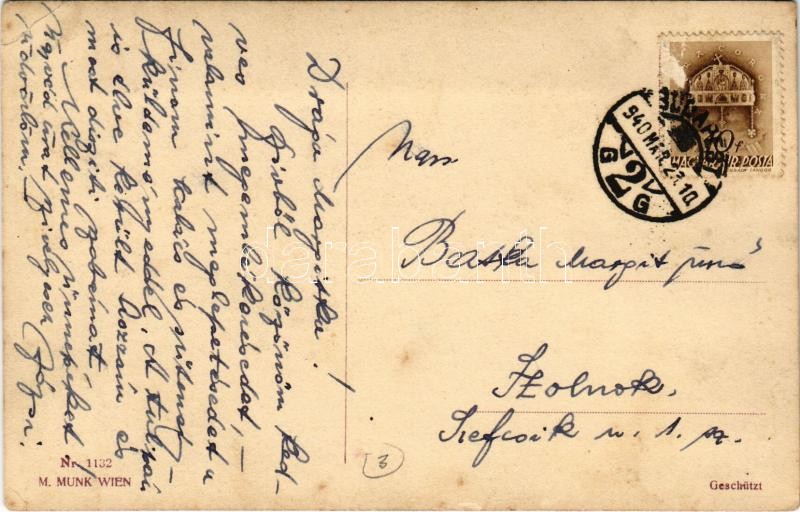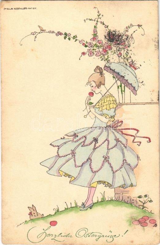 1940 Herzlichen Ostergrusse! / Easter greeting art postcard, lady with bunny. M. Munk Wien Nr. 1132. s: Mela Koehler (r)<a href="https://www.darabanth.com/hu/nagyaukcio/38/kategoriak~Kepeslapok/Muveszlapok~15729/1940-Herzlichen-Ostergrusse-Easter-gr