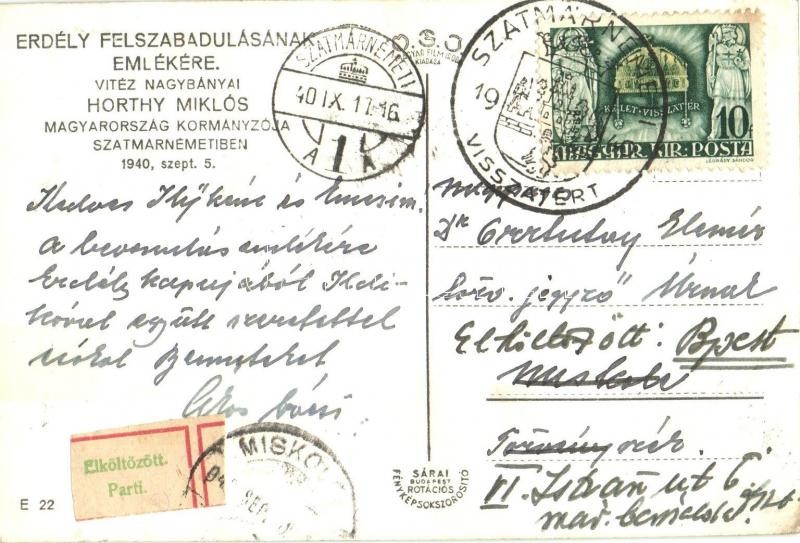 1940 Szatmárnémeti, Satu Mare; bevonulás, Horthy Miklós és vezérkara a díszszemlén / entry of the Hungarian troops, Horthy with the general staff at the parade ‘1940 Szatmárnémeti visszatért’ So. Stpl.<a href="https://www.darabanth.com/hu/nagyaukcio