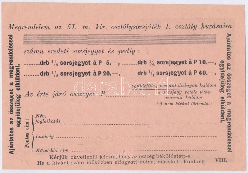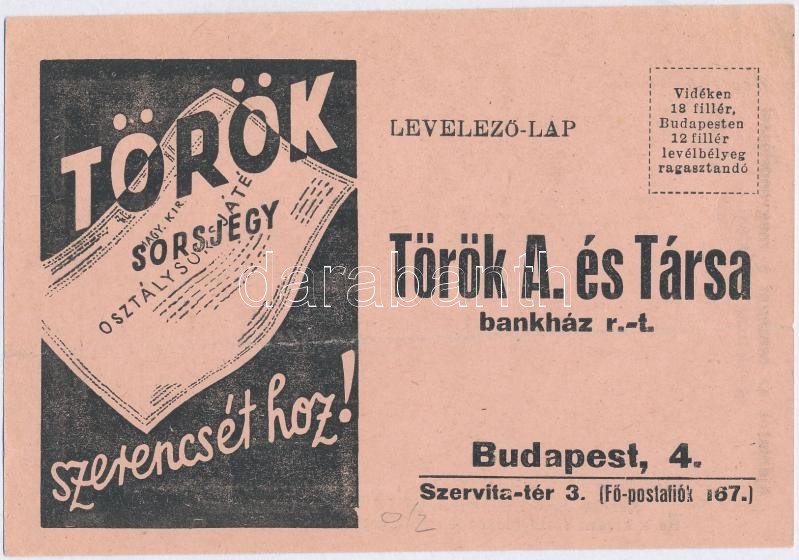 ~1940. ‘Török A. és Társa Bankház R.T.’ kitöltetlen levelezőlapos hirdetése a ’47. Magyar Királyi Osztálysorsjáték’ I. osztályú sorsjegyeinek rendeléséhez (EK)<a href="https://www.darabanth.com/hu/gyorsarveres/440/kategoriak~Kepeslapok/Reklam~200003