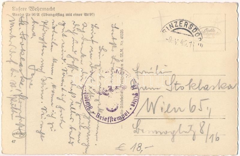 1940 Unsere Wehrmacht, Arado Ar 96 N (Übungsflug mit einer Ar 96) / Német Ar 96 egymotoros, alsószárnyas könnyű kiképző repülőgép / Arado Ar 96 German single-engine, low-wing trainer monoplane<a href="https://www.darabanth.com/hu/nagyaukcio/38/kateg