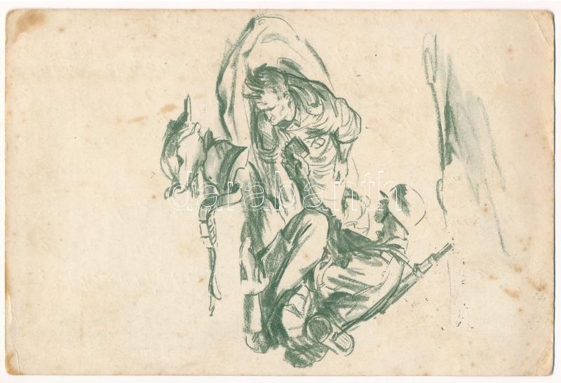 1941 Sanitäter hilft einem Verwundeten. Kampff im Osten. Skizzen aus dem Ostfeldzug. Herausgegeben von der Propaganda-Kompanie einer Armee / WWII German military art postcard, medic helps an injured soldier s: Ernst Eigener (EB)<a href="https://www.