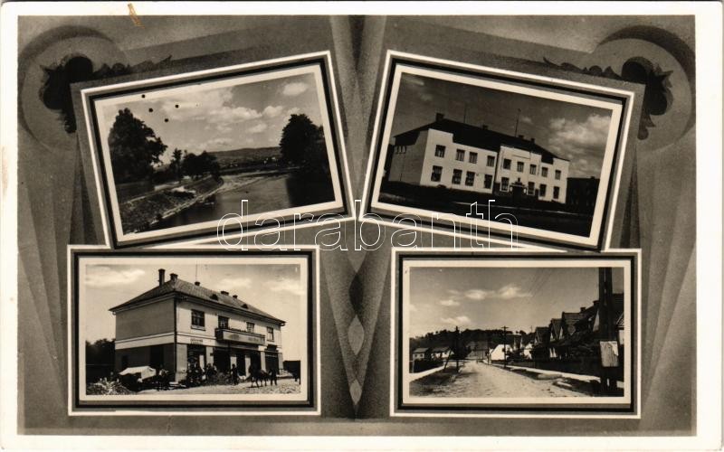 1942 Ilosva, Irsava, Irshava; folyó, községháza, Molnár László üzlete, fodrász, utca / river, town hall, shop, street, hairdresser