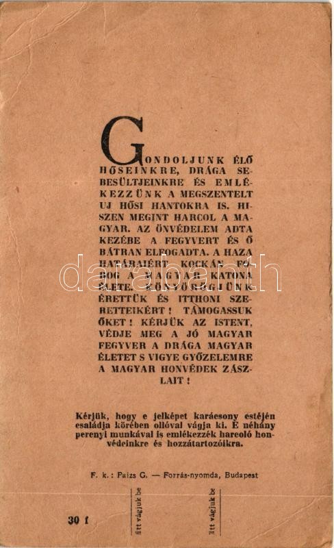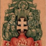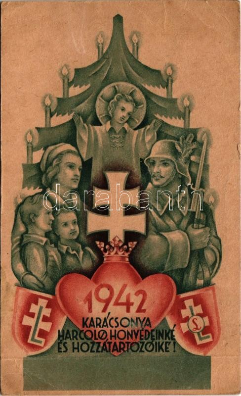 1942 Karácsonya Harcoló honvédeinké és hozzátartozóiké; levente szimbólumokkal, hajtható lap / WWII Hungarian military Christmas greeting with paramilitary youth organisation’s symbols (non PC) (EB)<a href="https://www.darabanth.com/hu/gyorsarveres/