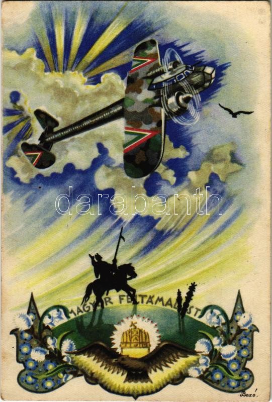 1942 Magyar feltámadást! / Hungarian irredenta propaganda art postcard, military aircraft s: Bozó (EK)<a href="https://www.darabanth.com/hu/gyorsarveres/417/kategoriak~Kepeslapok/Irredenta~1500032/1942-Magyar-feltamadast-Hungarian-irredenta-propagan