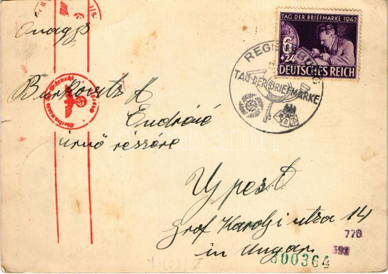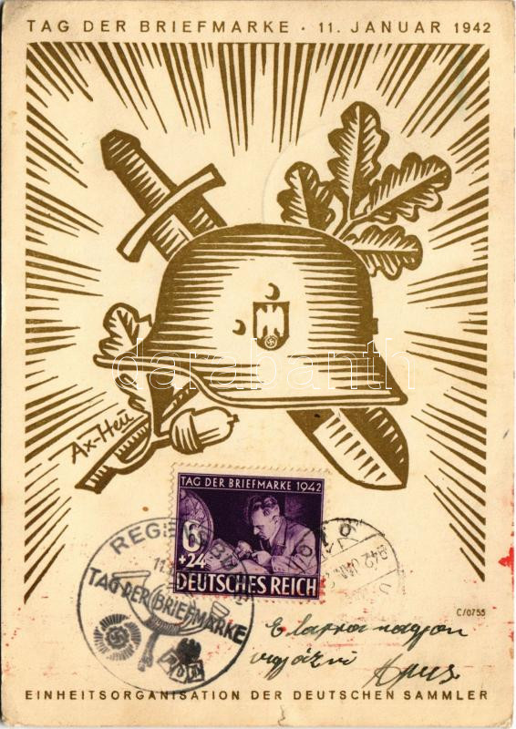 1942 Tag der Briefmarke. Einheitsorganisation der Deutschen Sammler / WWII Day of the German Stamp, NSDAP German Nazi Party propaganda, swastika s: Axster-Heudtlass + ‘Tag der Briefmarke 11. 1. 1942. REGENSBURG’ So. Stpl. (EK)<a href="https://www.da
