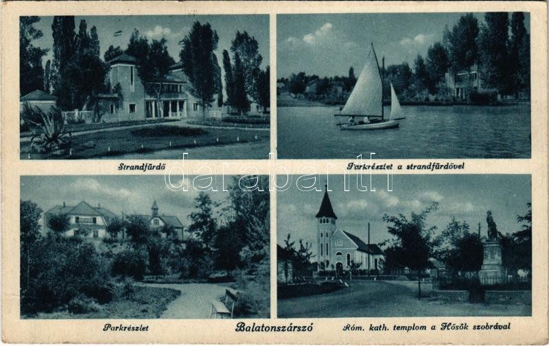 1943 Balatonszárszó, strandfürdő, park, római katolikus templom, Hősök szobra<a href="https://www.darabanth.com/hu/gyorsarveres/412/kategoriak~Kepeslapok/Magyarorszag~2000006/1943-Balatonszarszo-strandfurdo-park-romai-katolikus-templom-Hosok-szobra~