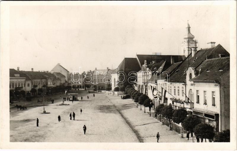1943 Kézdivásárhely, Targu Secuiesc; Fő tér, üzletek, magyar zászlók / main square, shops, Hungarian flags