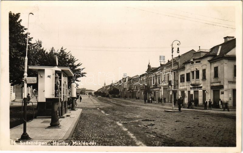 1943 Szászrégen, Reghin; Horthy Miklós tér, benzinkút, Alfred Graef, Martin Theil, Esztegar Emma üzlete, magyar zászlók, rendőr / square, gas station, shops, Hungarian flags, policeman (EK)<a href="https://www.darabanth.com/hu/gyorsarveres/410/kateg