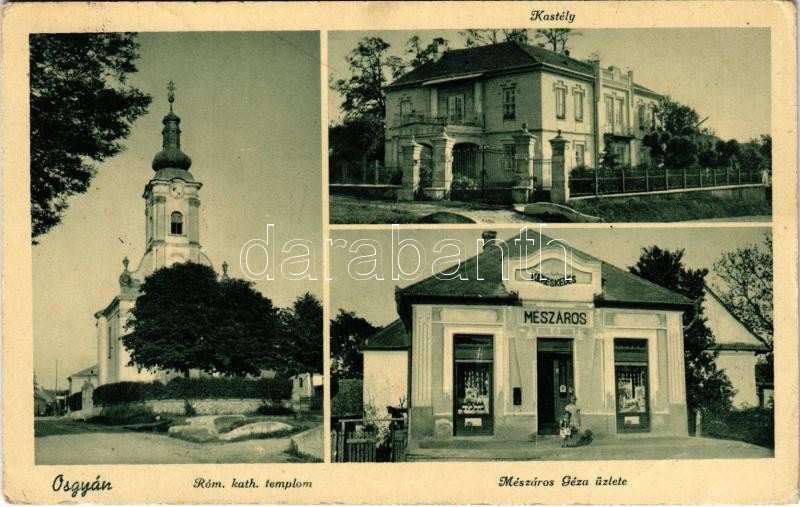 1944 Osgyán, Ozdany; Római katolikus templom, kastély, Mészáros Géza üzlete és saját kiadása / Catholic church, castle, publisher’s shop (EK)
