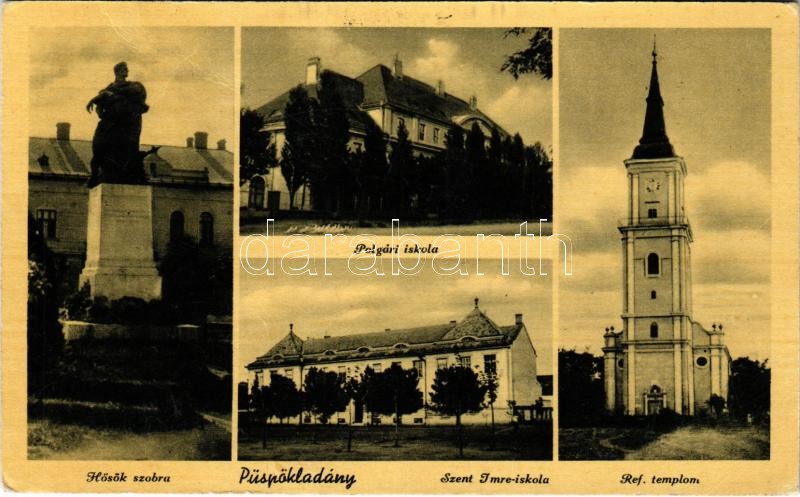 1944 Püspökladány, Református templom, Polgári iskola, Hősök szobra, emlékmű, Szent Imre iskola (EK)