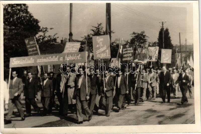 1952 Szombathely, A 8. szabad május 1-i felvonulás, ‘Szocialista számvitellel a békéért’ tábla. photo (non PC) (EK)<a href="https://www.darabanth.com/hu/gyorsarveres/415/kategoriak~Kepeslapok/Magyarorszag~1000005/1952-Szombathely-A-8-szabad-majus-1-