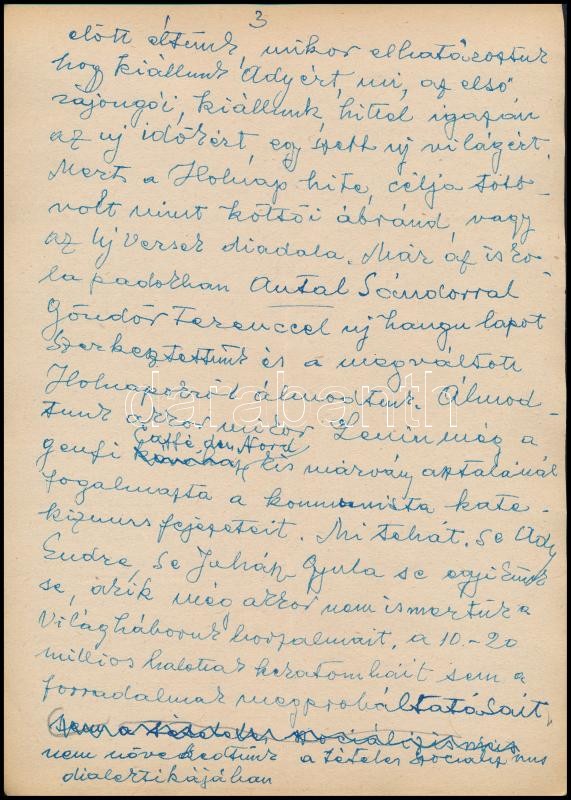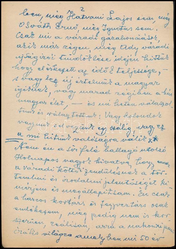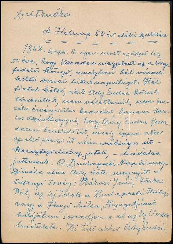 1958 Dutka Ákos (1881-1972) költő, író saját kézzel írt, „A Holnap 50 év előtti születése” c. megemlékező írásának kézirata, aláírással, 12 beírt oldal. A Holnap irodalmi antológiát 1908-ban 7 költő, Ady Endre, Babits Mihály, Balázs Béla, Dutka Ákos, Emőd