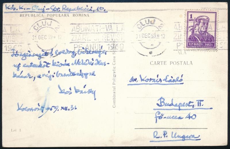 1959 Kolozsvár, Kós Károly (1883-1977) író, építész, grafikus saját kézzel írt üdvözlő képeslapja, autográf aláírásával.
