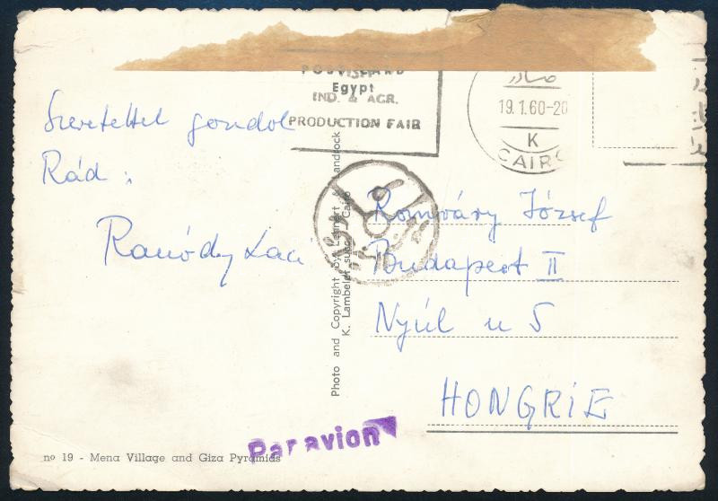 1960 Ranódy László (1919-1983) filmrendező által írt képeslap Egyiptomból / Autograph signed postcard of Hungarian director Laszló Ranody