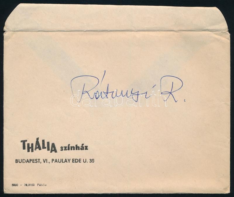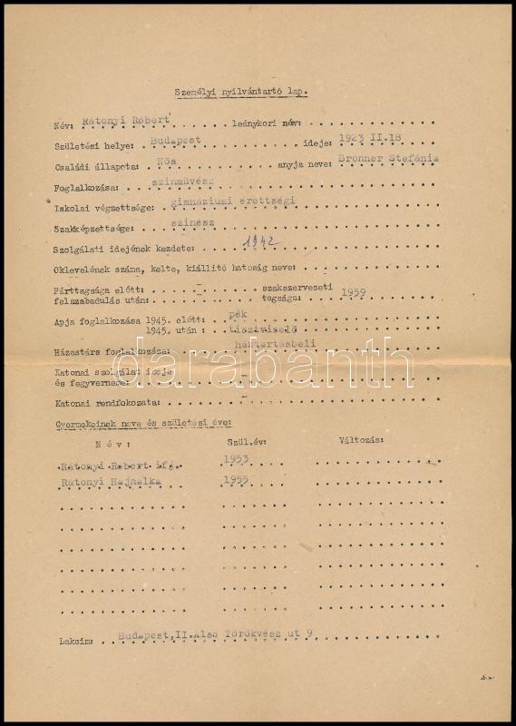 1971 Rátonyi Róbert (1923-1992) színművész autográf aláírással ellátott önéletrajza 3 gépelt oldalon valamint színházi adatlapja<a href="https://www.darabanth.com/hu/gyorsarveres/424/kategoriak~Mutargy-papirregiseg-egyeb/Tortenelmi-dokumentumok-kezi