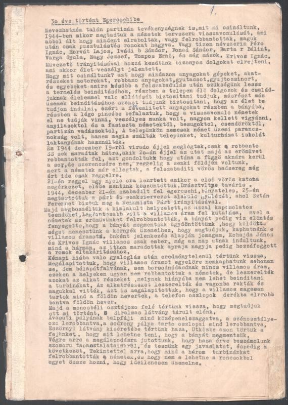 1974 Egercsehi, Nagy József visszaemlékezése az 1944-es II. világháború végi helyi eseményekre (3 gépelt oldal), valamint 3 gépelt verse, 5 beragasztott fotó, közte 2 a szerző fotója, 3 pedig 1920-1925 körüli fotók kommunista munkás fiatalokról, 7 sztl. l
