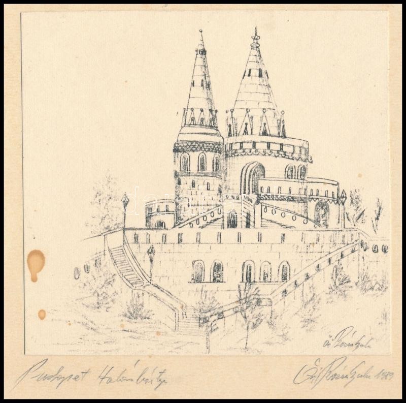 1989 Rózsa Gyula (?-): Halászbástya, Budapest. Nyomat, papír. Jelzett. Kissé foltos. Papírra kasírozva. 11×12 cm.<a href="https://www.darabanth.com/hu/gyorsarveres/432/kategoriak~Festmenyek-es-grafikak/Festmenyek-es-grafikak~500023/1989-Rozsa-Gyula-