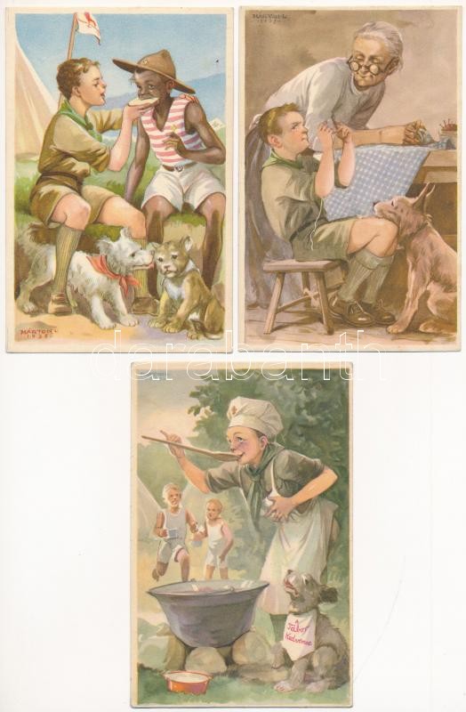 3 db RÉGI Márton L.-féle Cserkészlevelezőlapok Kiadóhivatal képeslap Márton L. szignóval / 3 pre-1945 Hungarian scout art postcards