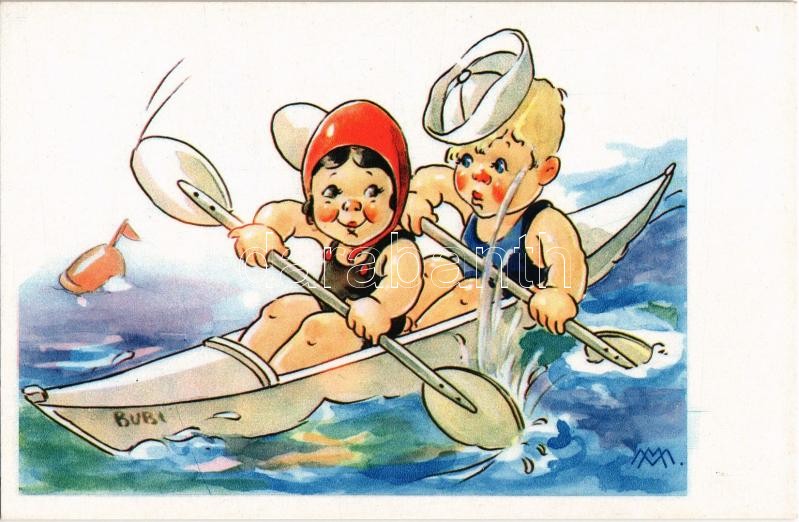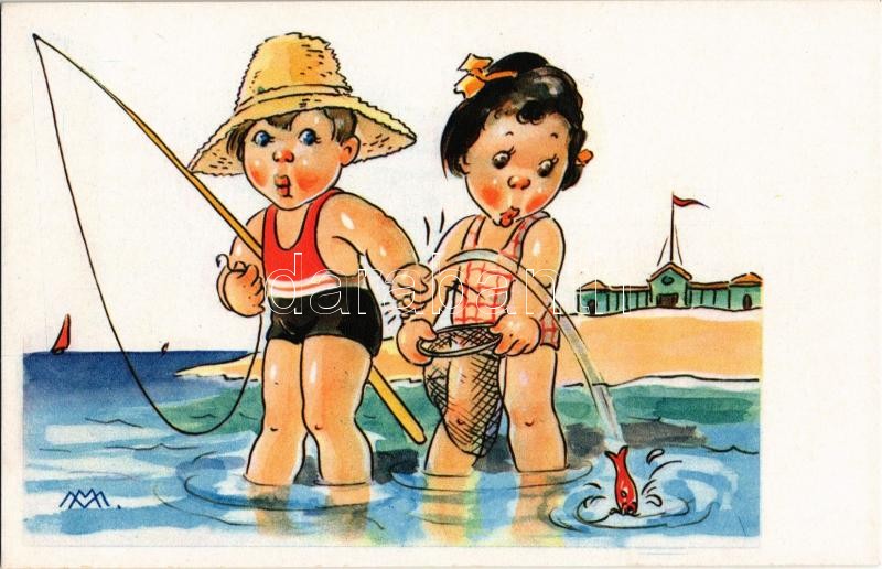 4 db régi olasz művészlap, gyerekek a strandon / 4 pre-1945 Italian art postcard, children on the beach. Cecami Nr. 1031. s: M. M.<a href="https://www.darabanth.com/hu/gyorsarveres/417/kategoriak~Kepeslapok/Muveszlapok~1500040/4-db-regi-olasz-muvesz