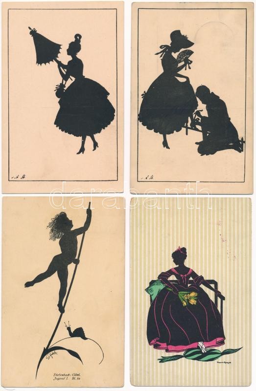 4 db régi sziluettes művész motívum képeslap / 4 pre-1945 silhouette art motive postcards