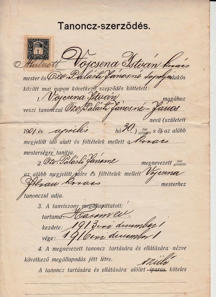 1913 Tanonc szerződés okmánybélyeggel és a Topolyai Ipartestület pecsétjével